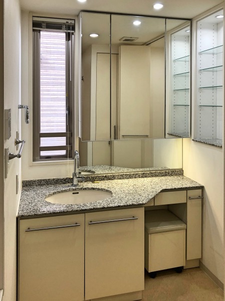 洗面は、既存のI型プランですとかなり手狭で、洗面カウンターの右側がすぐ洗濯機置き場になっていて落ち着かないため、カウンターをL型プランに拡張してビルトインの洗濯乾燥機を組み込み、ゆとりがある洗面カウンターに変更しようと考えています。