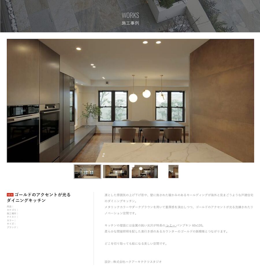 ゴールド入りのキッチン壁面タイルや真鍮の金物をアクセントに用いることで、もともとの場が持つスケール感を静かで落ち着きのある空間へと整えています。