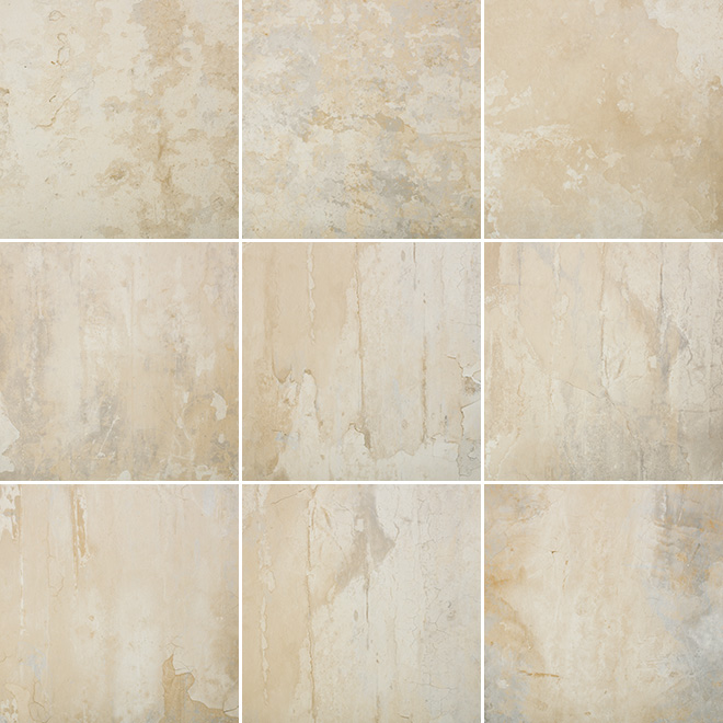 ショールームでお施主様とご一緒に素材を探すなかで、最も気に入っていただいたタイルでした。ベージュのグラデーションにブルーグレイのアクセントが絶妙に調和した60cm角のタイルで、柄パターンのバリエーションが豊富なことも特徴のひとつです。その陰影がシックな雰囲気を生み出しています。