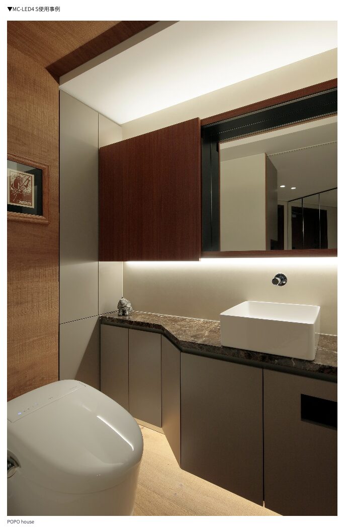 POPO house のキッチンとゲスト用トイレの写真が、照明計画の実例として紹介されています。