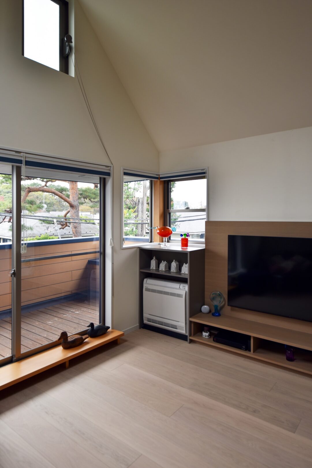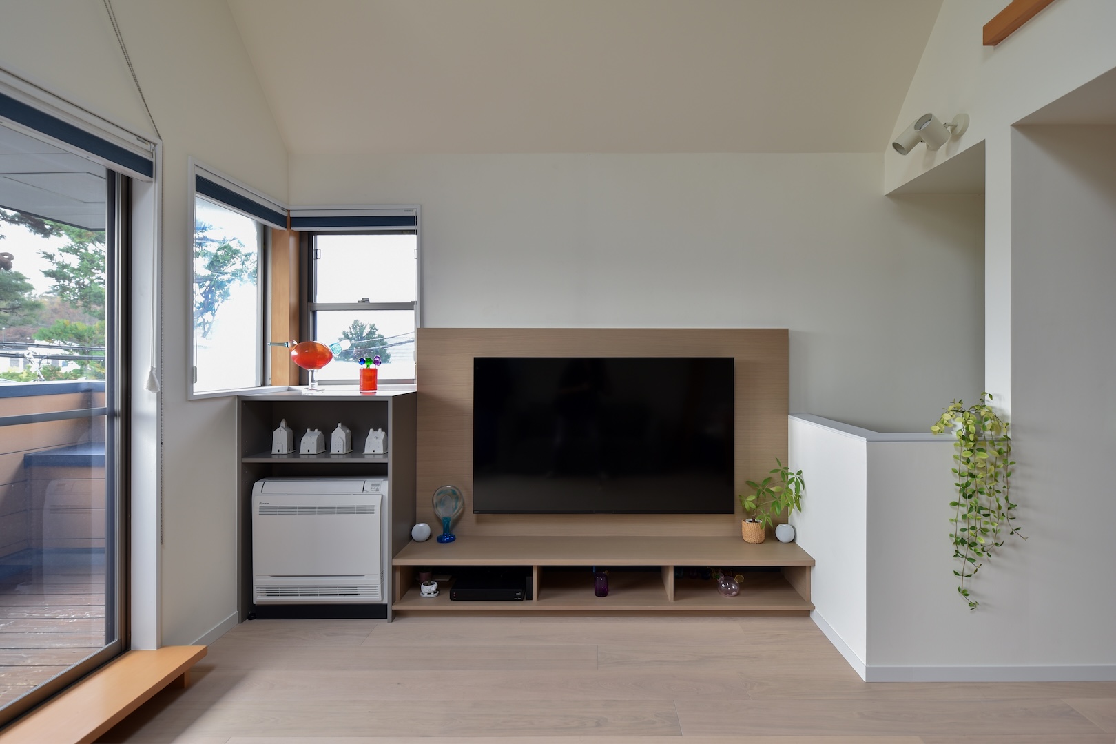 フローリングの劣化に対しては、既存の赤褐色のケンパス材の上から新たにフレンチオーク材を貼る工事をしている。フレンチオークの上質な素材感とアイボリーカラーが空間を明るく柔らかな表情へと変え、新たな印象をもたらしている。TVボードや収納家具もインテリアに合わせて新たに製作し、内装を丁寧に補修することで、新築当時の清潔感を取り戻すとともに、北欧デザインを愛する施主のコレクションとも自然に調和し、静かで新たな表情をもつ住まいへと生まれ変わっている。