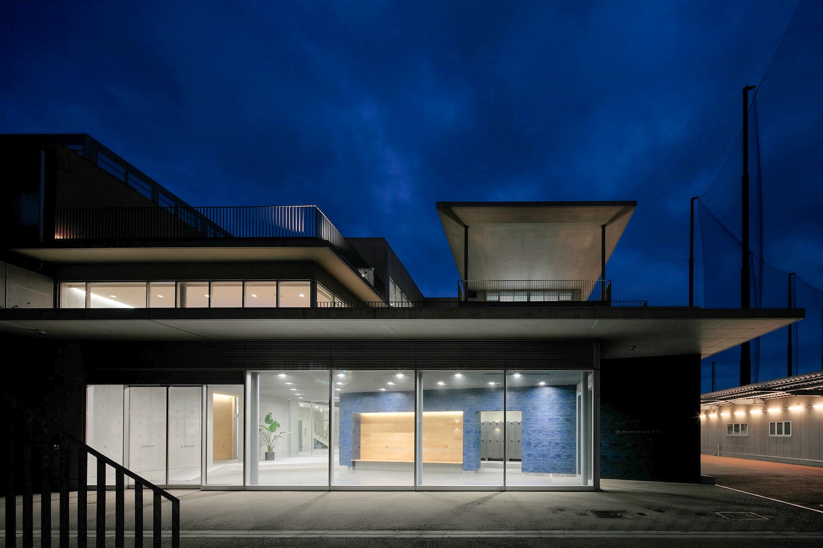 選手寮を屋外練習場・屋内練習場と一体的に配置し、トレーニングルームから日常的にグラウンドを望める環境を整えることで、練習と生活が自然につながり、選手が「強くなるための日常」を送るための環境が生まれた。選手寮とランドマークとなる屋内練習場が連続するファサードはまちのシンボルとなり、プロ野球チームとまちが共に成長していく場となっている。